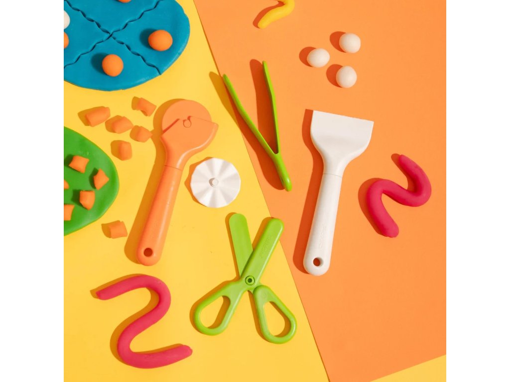 - Rôznorodé nástroje na modelovanie plastelíny: valček, špachtľa, koliesko a pinzeta – všetko, čo potrebuje malý umelec na tvorenie