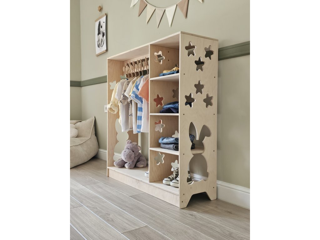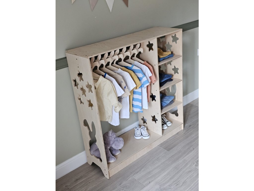 Premeňte priestor vášho dieťaťa pomocou montessori šatníka "Bunny", ktorý je navrhnutý tak, aby podporoval samostatnosť a poriadok už od útleho veku. Táto jedinečná skriňa, inšpirovaná princípmi montessori, umožňuje deťom spravovať si vlastné oblečenie s prístupnými policami a priestormi na zavesenie v ich výške.
