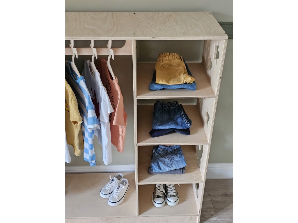 Nie je to len jednoduchá skrinka, ale vzdelávacia pomôcka. Učí základné životné zručnosti, ako je výber vlastného oblečenia, usporiadanie priestoru a udržiavanie poriadku. Jeho estetický, minimalistický dizajn vhodný pre deti sa dokonale prispôsobí každej izbičke, pričom kombinuje funkčnosť a štýl.