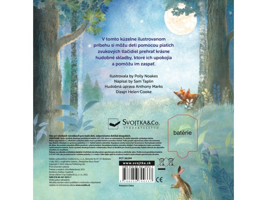 Objavujte s deťmi krásy prírody a vzácne okamihy stíšenia, keď sa les aj riečka ukladajú na spánok. Pevné stránky knihy dopĺňajú zvukové tlačidlá, ktoré po stlačení spustia nádherné melódie známych skladieb, a celok dotvárajú kúzelné ilustrácie.