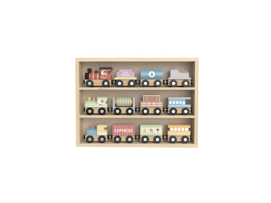 Vláčiky na drevenú vláčikodráhu. Deti sa s nimi ale môžu hrať aj samostatne. Zlepšujú si jemnú motoriku, koordináciu ruka-oko a rozvíjajú si predstavivosť. Pri hre v skupine si trénujú svoje sociálne a komunikačné zručnosti. Vláčiky Sú vyrobené z dreva z udržateľného lesníctva a s ohľadom na bezpečnosť detí.