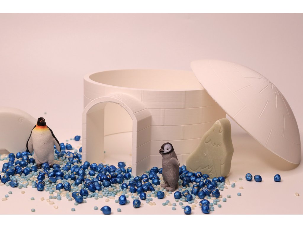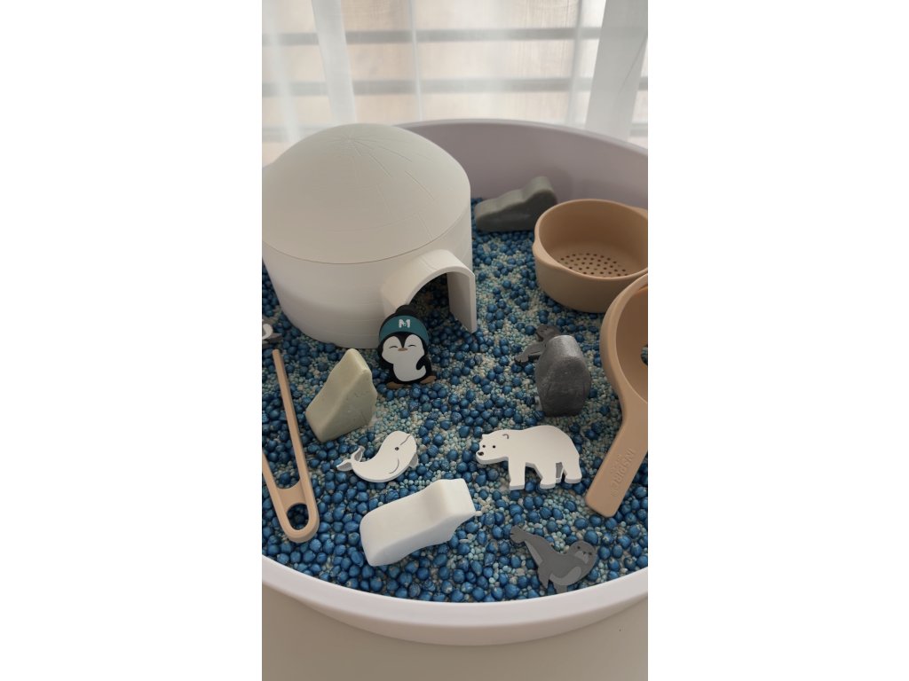 Vďaka odnímateľnej streche môžu deti do iglu schovávať zvieratká, kamienky, farebnú ryžu, malé poklady či iné senzorické materiály. Každá hra tak rozvíja fantáziu, jemnú motoriku aj zmyslové vnímanie.