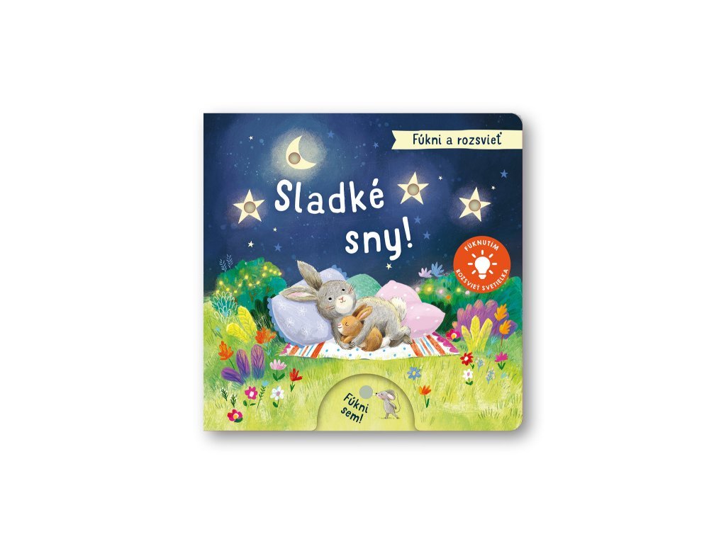 Fúkni, rozsvieť, začítaj sa - fúknutím rozsvieť svetielka. Pre zvieratká je čas ísť spať. Ale než sa zatvoria všetky očká, priletí snová víla. Prifúkne Medvedíkovi penu do kúpeľa a hviezdny prach pre malé Jazvece. A mesiačik? Snová víla mu svojím fúknutím rozsvieti kamarátky na oblohe - hviezdičky! Fúkni na knižku a nechaj aj ty rozžiariť svetielka!