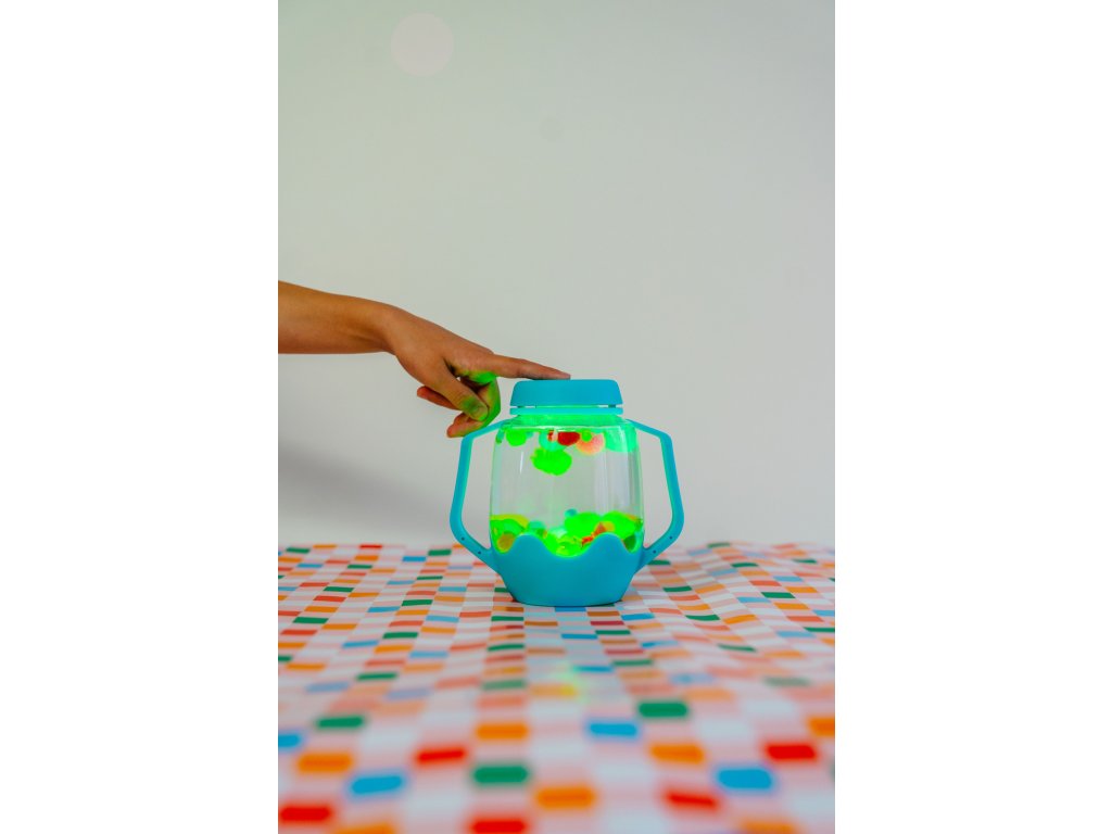 Zmyslové nádoby Glo Pals ponúkajú viac než len zábavu! Meniace sa farby svetla deti zaujmú, zatiaľ čo pozorovanie plávajúcich prvkov vo vode ich upokojí a uvoľní. Vytváranie nádob s rôznymi motívmi, jednofarebnými doplnkami alebo šumivými prvkami zvyšuje kreativitu a predstavivosť dieťaťa. Do nádoby môžete pridať aj naše svietiace senzorické kocky, aby bola hra ešte vzrušujúcejšia! Najlepší zážitok z hry prináša pozorovanie plávajúcich zmyslových predmetov, ktoré plávajú vo vode alebo klesajú na dno. Skúste pohárom zatriasť, aby ste vytvorili vlny a vírenie vody.