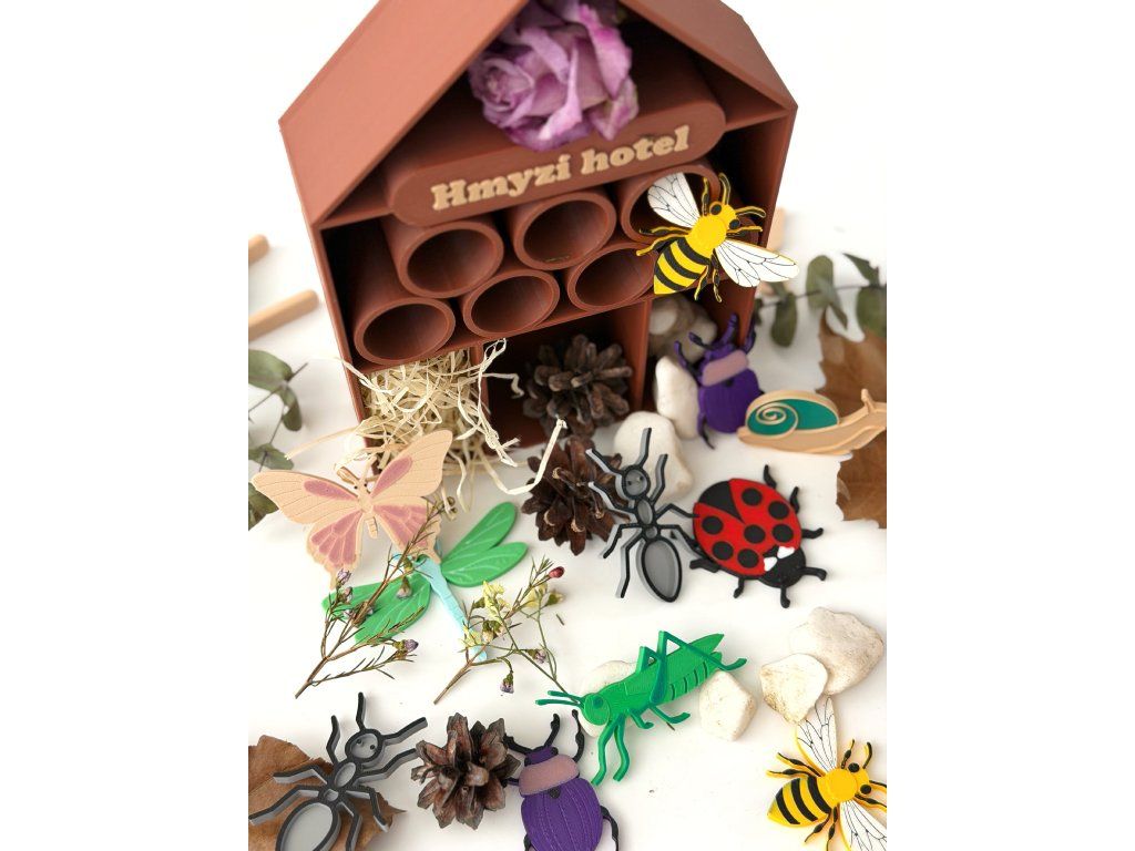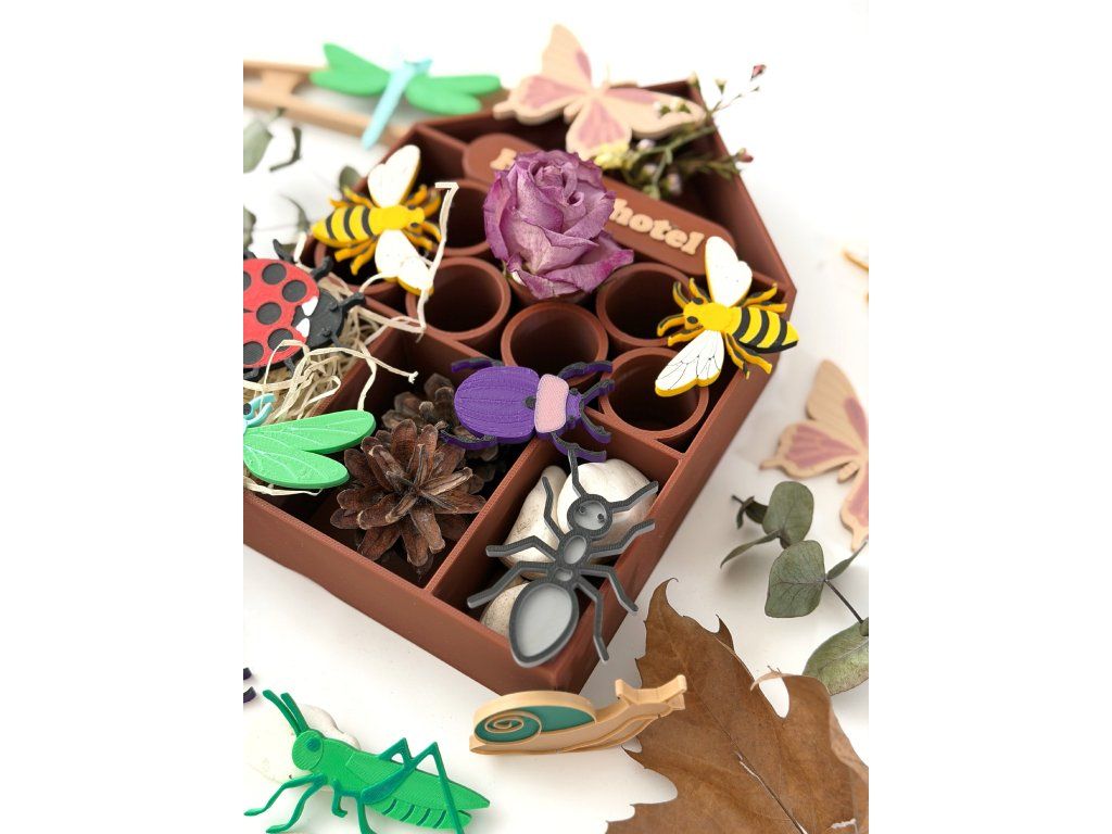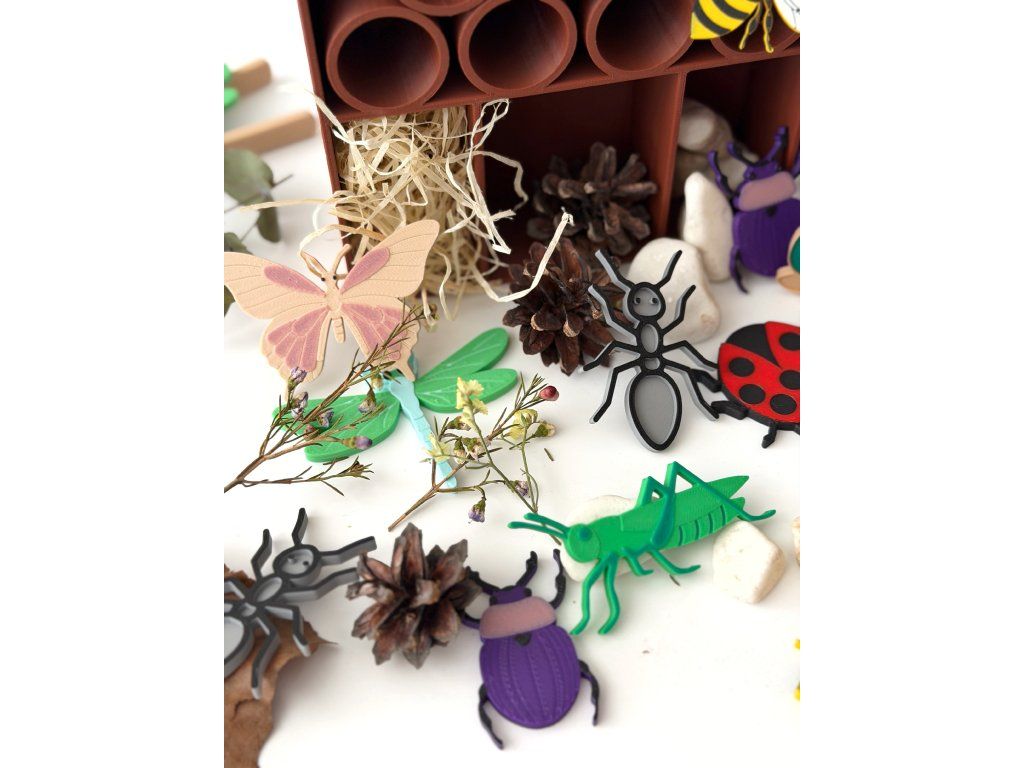 - 13 ks EKO (3D tlač) figúrok hmyzu ( 2ks motýľ, 2ks včela, 2ks vážka, 2ks chrobák, 2ks mravec, 1ks lienka, 1ks lúčny koník, 1ks slimák)