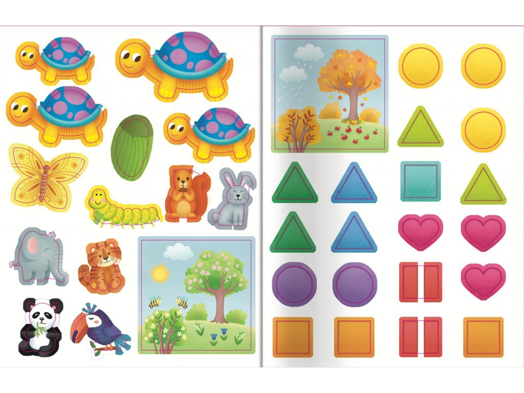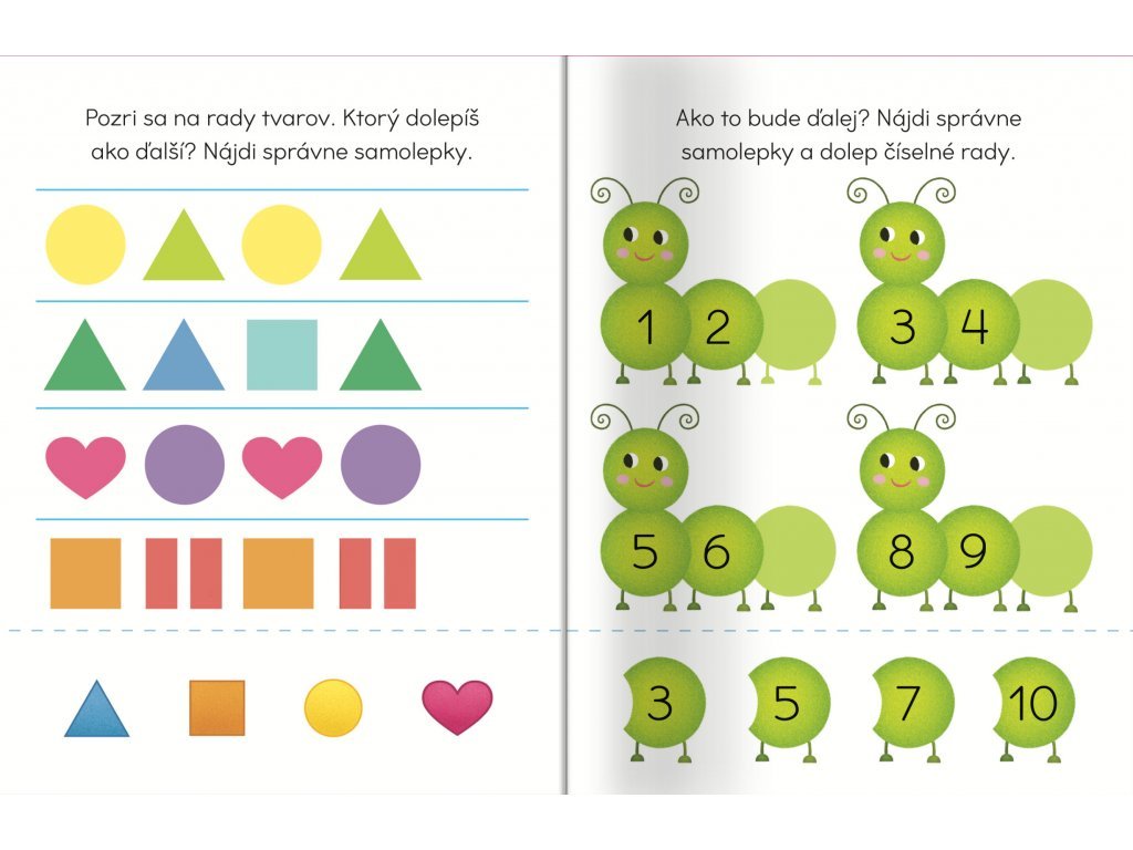 Pestrofarebné úlohy na priraďovanie a dopĺňanie obrázkov podporujú schopnosť učiť sa, vnímať postupnosti podľa tvarov, farieb aj čísel a trénovať koncentráciu. Na každej strane deti pracujú so samolepkami, ktoré nalepujú na vyznačené miesto a dokončujú tým zadaný obrázok. Takto si precvičia vizuálne vnímanie, početné zručnosti, jemnú motoriku a zároveň zažijú radosť z úspešného dokončenia úlohy.