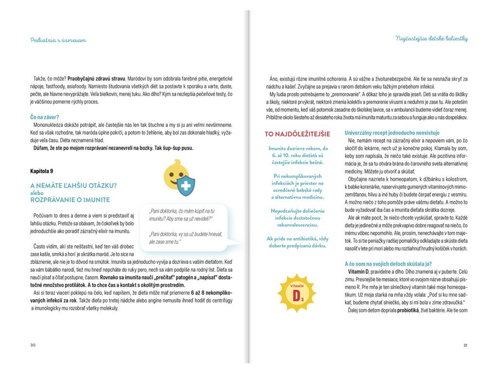 Autorka, známa zo svojho úspešného blogu, sa s humorom a nadhľadom prihovára rodičom, ktorí hľadajú praktické rady v ťažkých chvíľach, keď je dieťa choré. Jej najčítanejšie články teraz nájdete v tejto knihe. Dozviete sa všetko o najčastejších detských chorobách, dostanete množstvo užitočných tipov z pediatrickej praxe a osvedčené odporúčania priamo z ordinácie.