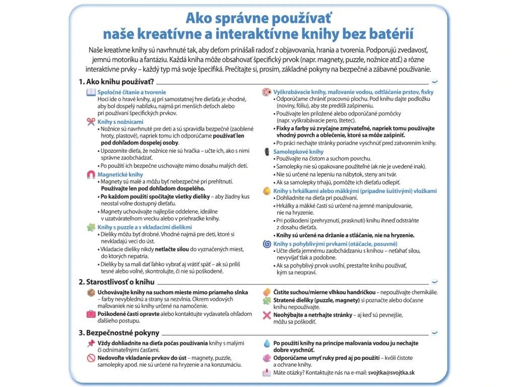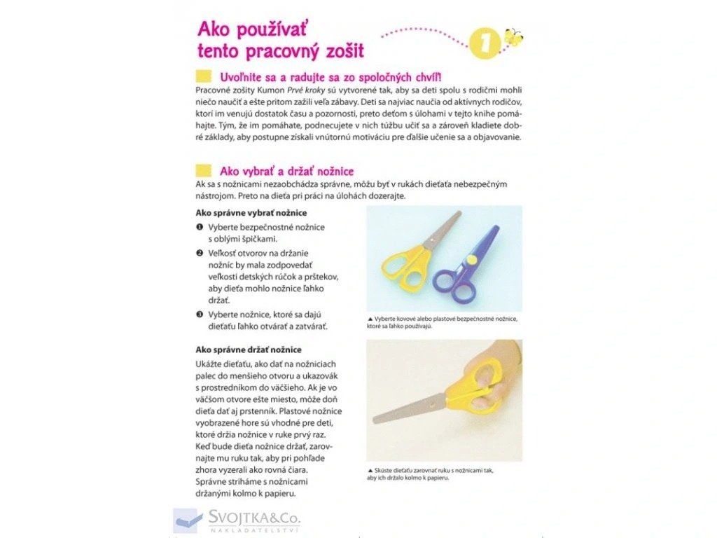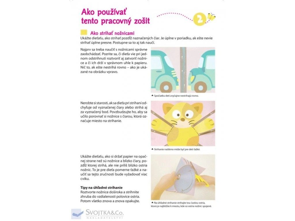Zošit je zostavený tak, aby deti popri zdokonaľovaní práce s nožnicami rozširovali aj svoju slovnú zásobu – pri strihaní rovných a zakrivených čiar či vystrihovaní kruhov a zvierat si prirodzene prepájajú nové slová s príslušnými tvarmi. Úlohy podporujú tvorivosť, predstavivosť a schopnosť skladania rôznych tvarov, vďaka čomu sa učenie stáva zábavným a zmysluplným.
