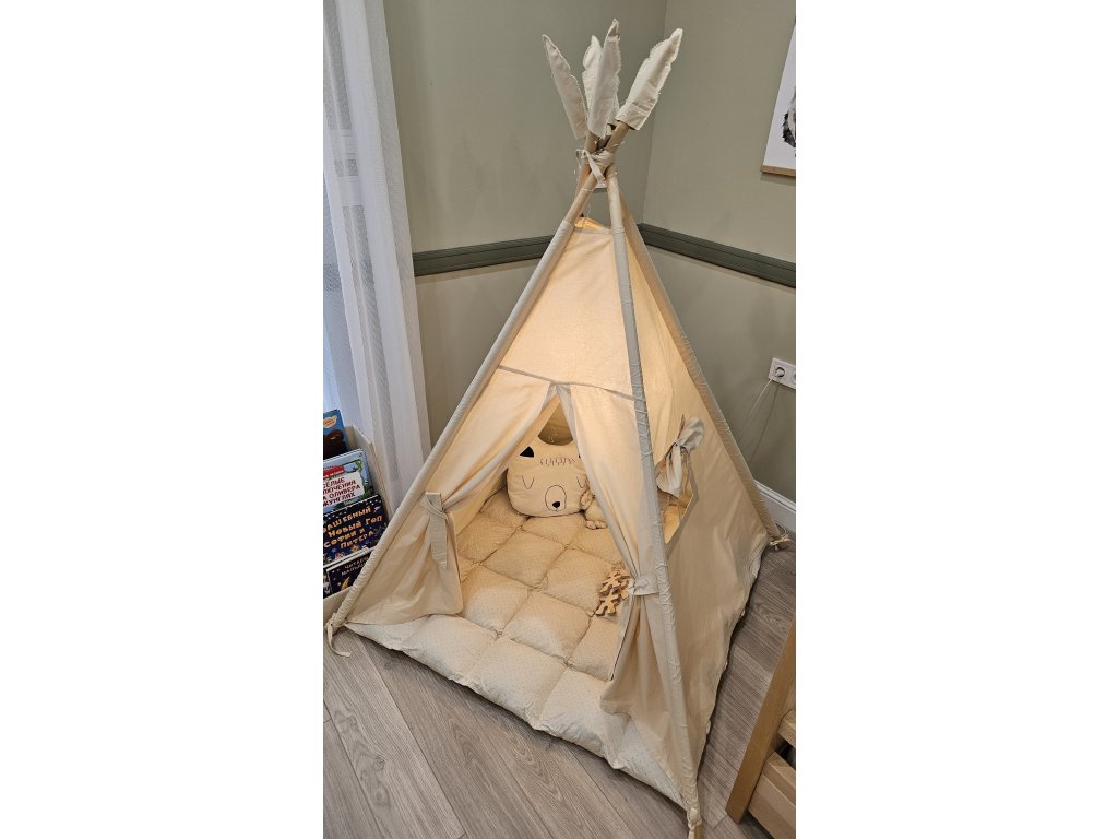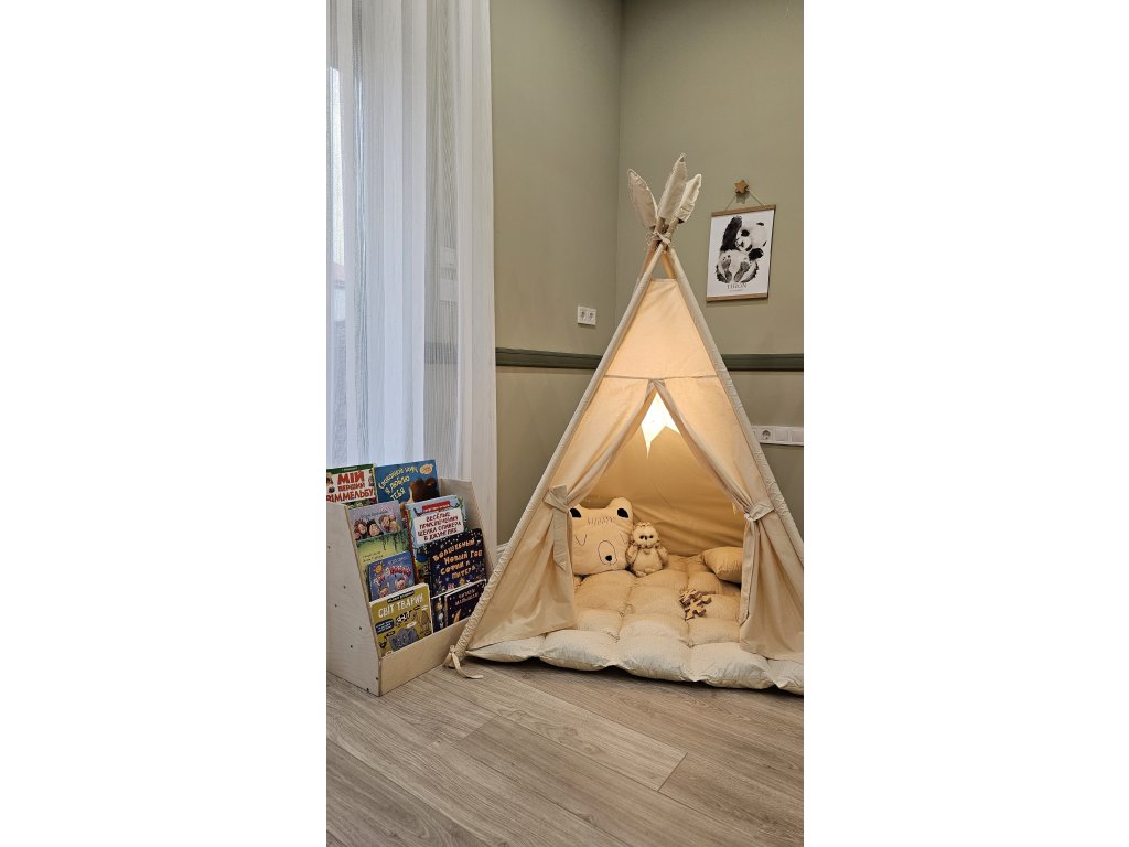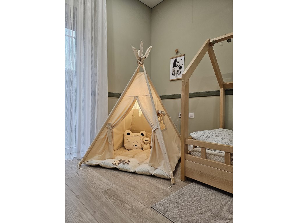 Náš stan Wigwam je skonštruovaný s pevným dreveným rámom a vysokokvalitnou látkou, čím vytvára bezpečné a útulné prostredie pre vaše dieťa. Jeho priestranný interiér ponúka dostatok priestoru na hodiny kreatívneho skúmania, či už ide o tajnú skrýšu, kútik na čítanie alebo čarovný hrad. Tkanina je mäkká a priedušná, zaisťuje pohodlie a stimuluje uzdu fantázie.