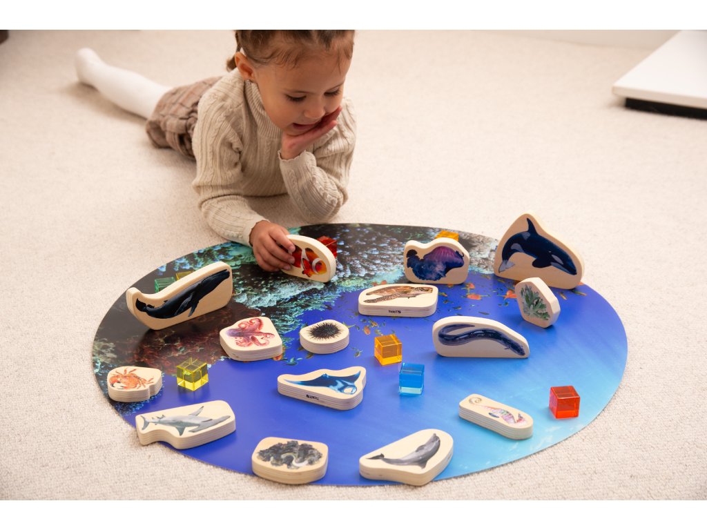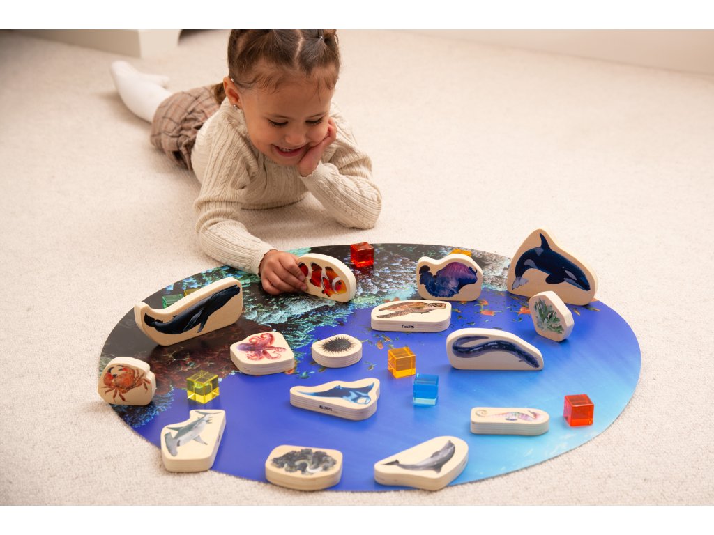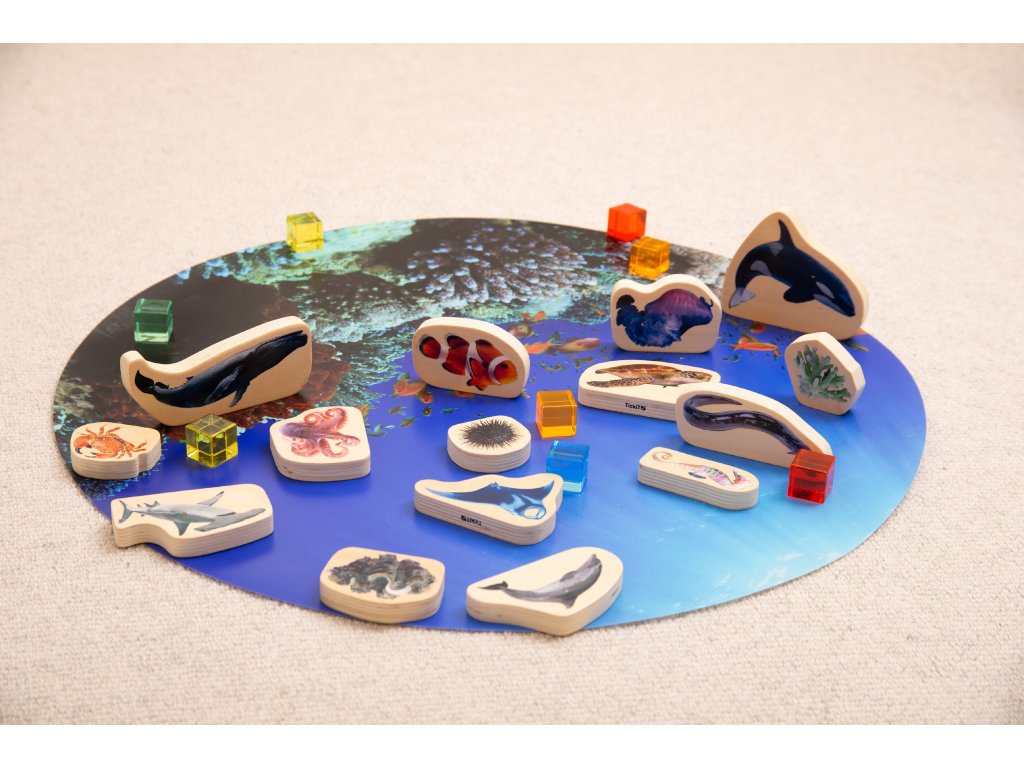 Robustné drevené kocky sú hladké na dotyk a malé deti s nimi môžu ľahko manipulovať, postaviť ich a stohovať. Realistické obrázky umožnia mladším deťom naučiť sa názvy a charakteristiky rôznych živočíchov a rastlín z mora a jeho okolia a staršie deti podnietia k tomu, aby lepšie pochopili tieto fascinujúce formy života, vizualizovali si ich pri rozprávaní príbehov alebo tvorivom písaní a diskutovali o otázkach životného prostredia.