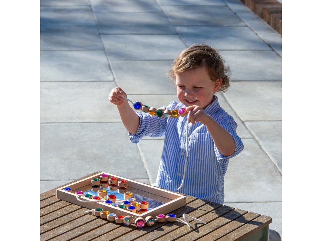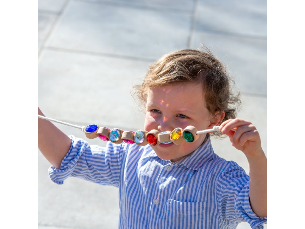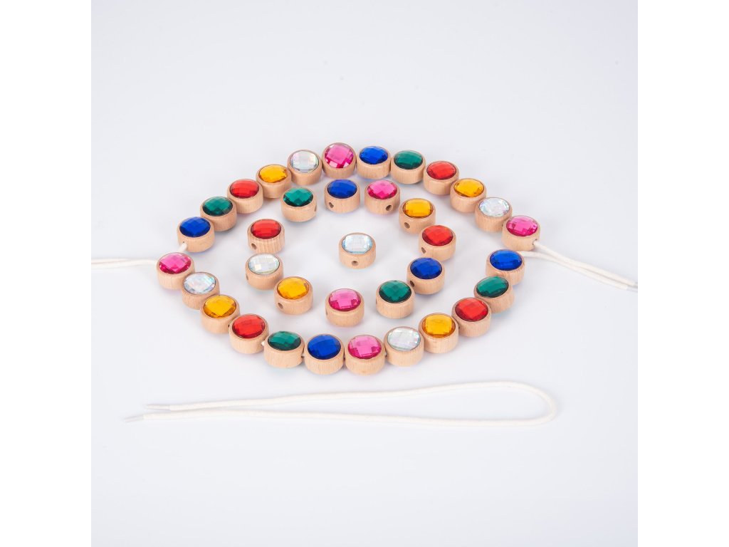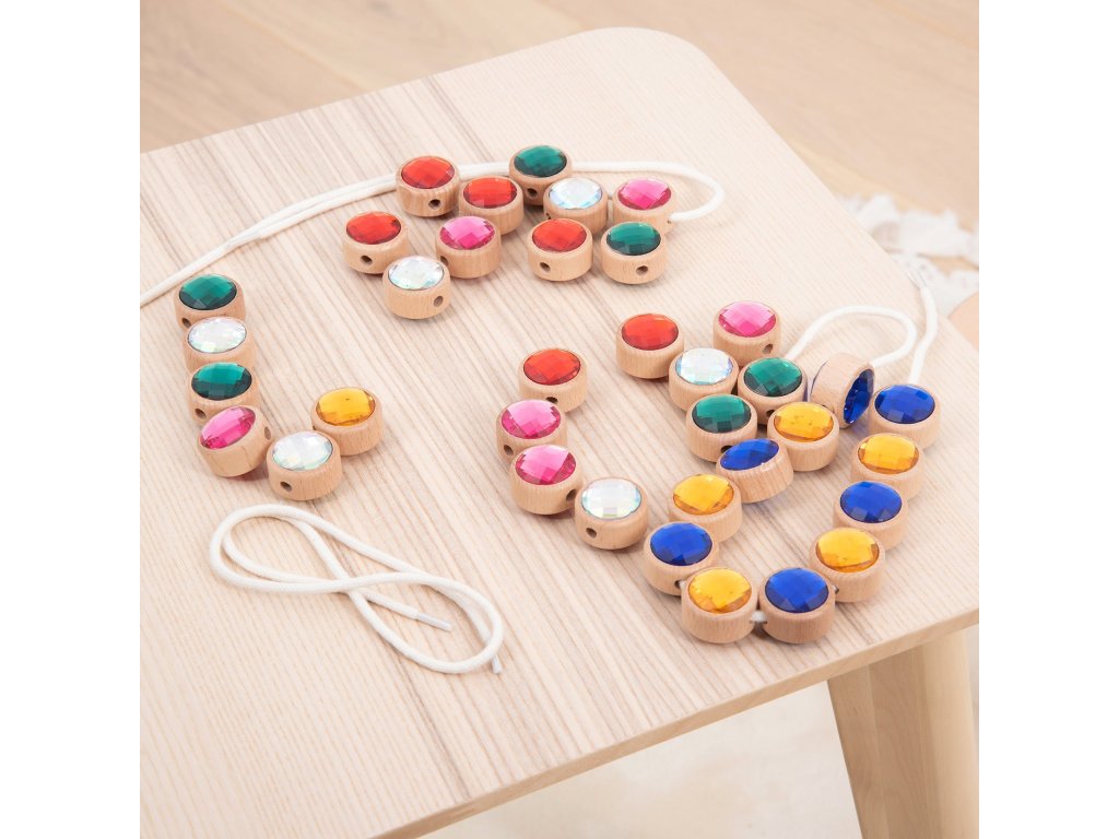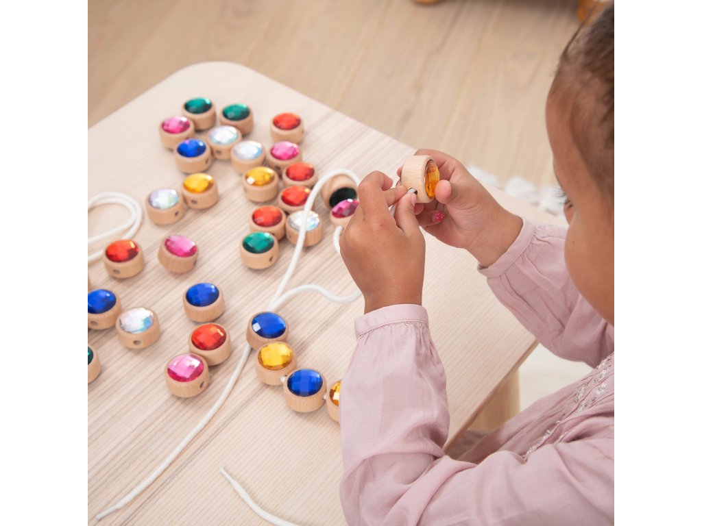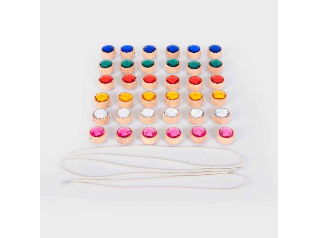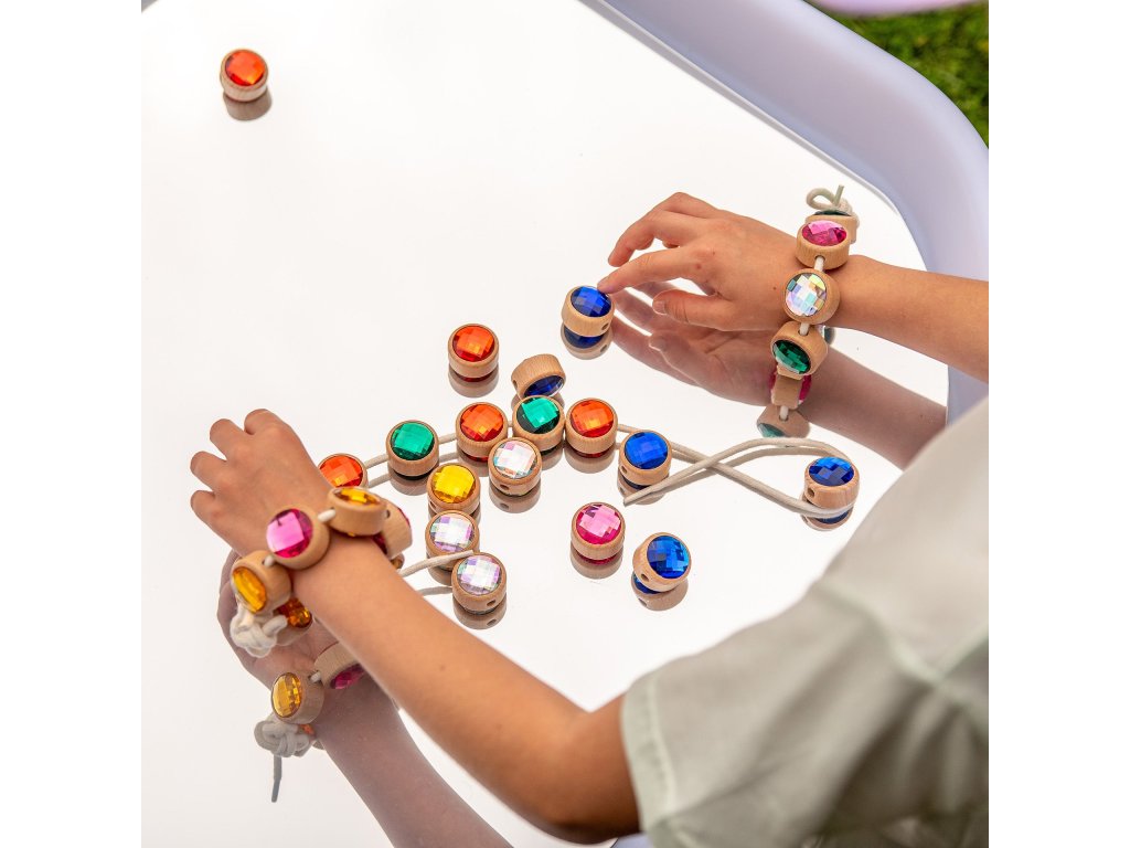 Každý drevený rámik má v strede otvor na prevliekanie, vďaka čomu je možné drahokamy navliekať na šnúrku a tvoriť rôzne vzory a sekvencie. Deti tak získavajú nekonečné možnosti tvorivej hry, ktorá podporuje kreativitu, koncentráciu aj rozvoj jemnej motoriky.