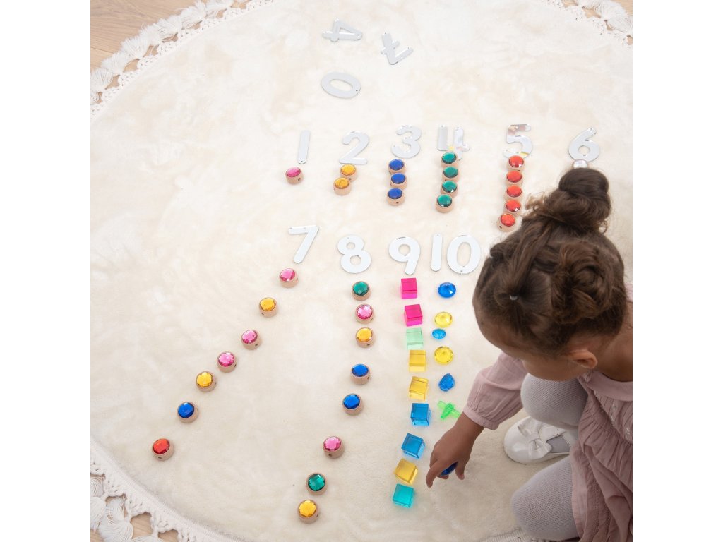 Každý drahokam je obojstranný, s lešteným a fazetovaným povrchom, ktorý krásne odráža svetlo a zdôrazňuje žiarivé, lesklé farby. Vďaka robustnému spracovaniu sú drahokamy vhodné aj pre malé detské ruky a podporujú zmyslové vnímanie, jemnú motoriku a tvorivosť.