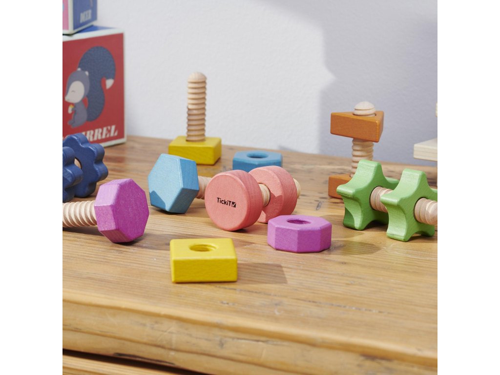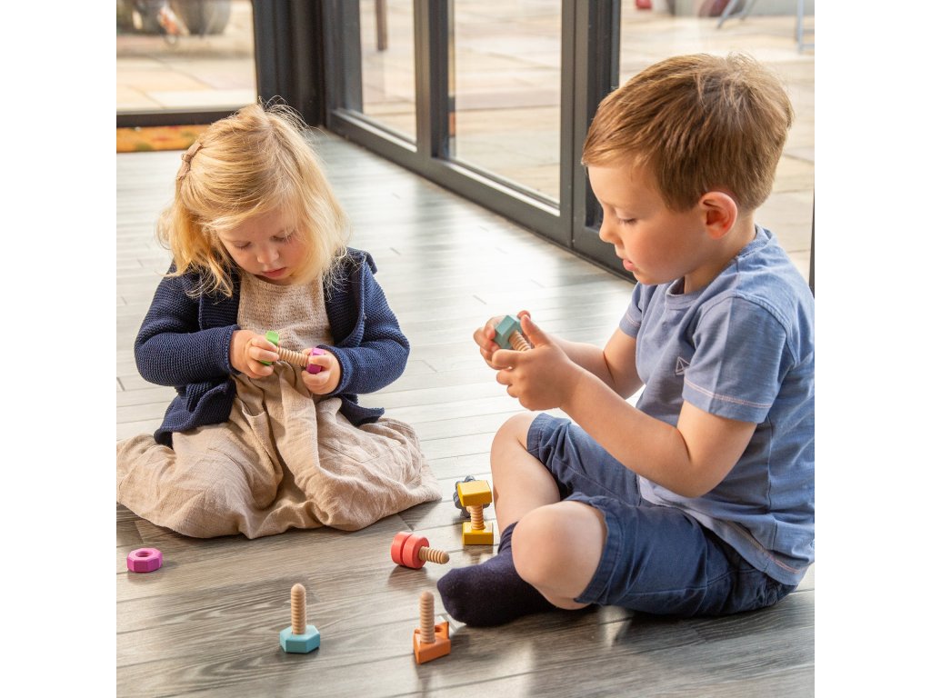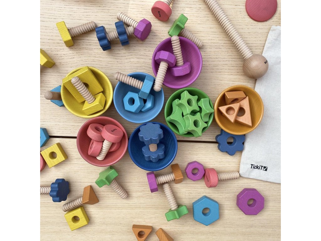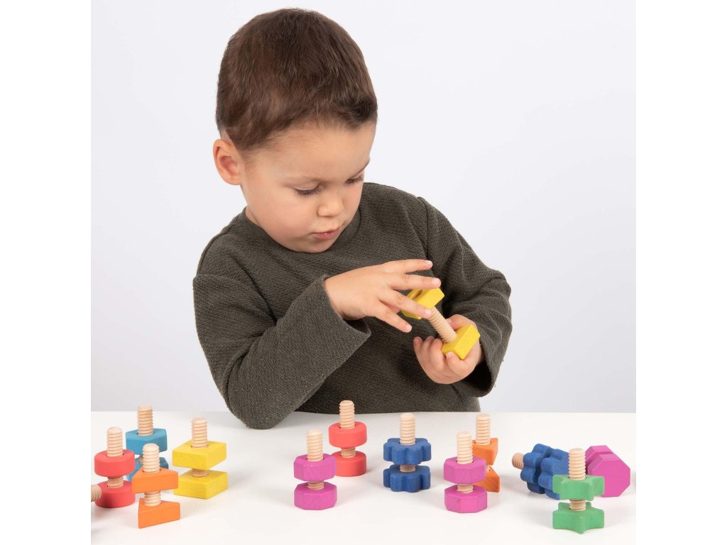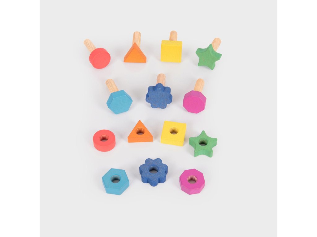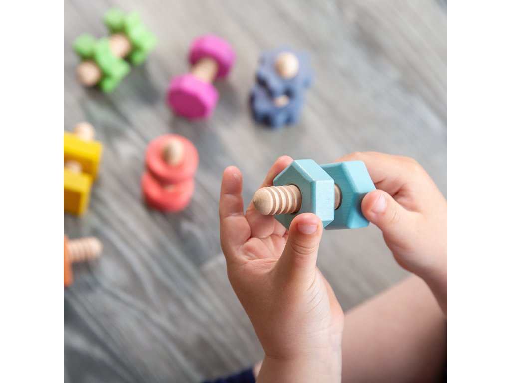 Tieto drevené diely sú ideálne pre malé deti na učenie farieb, tvarov a párovania, pričom hravou formou zisťujú, ako do seba matice a skrutky zapadajú.