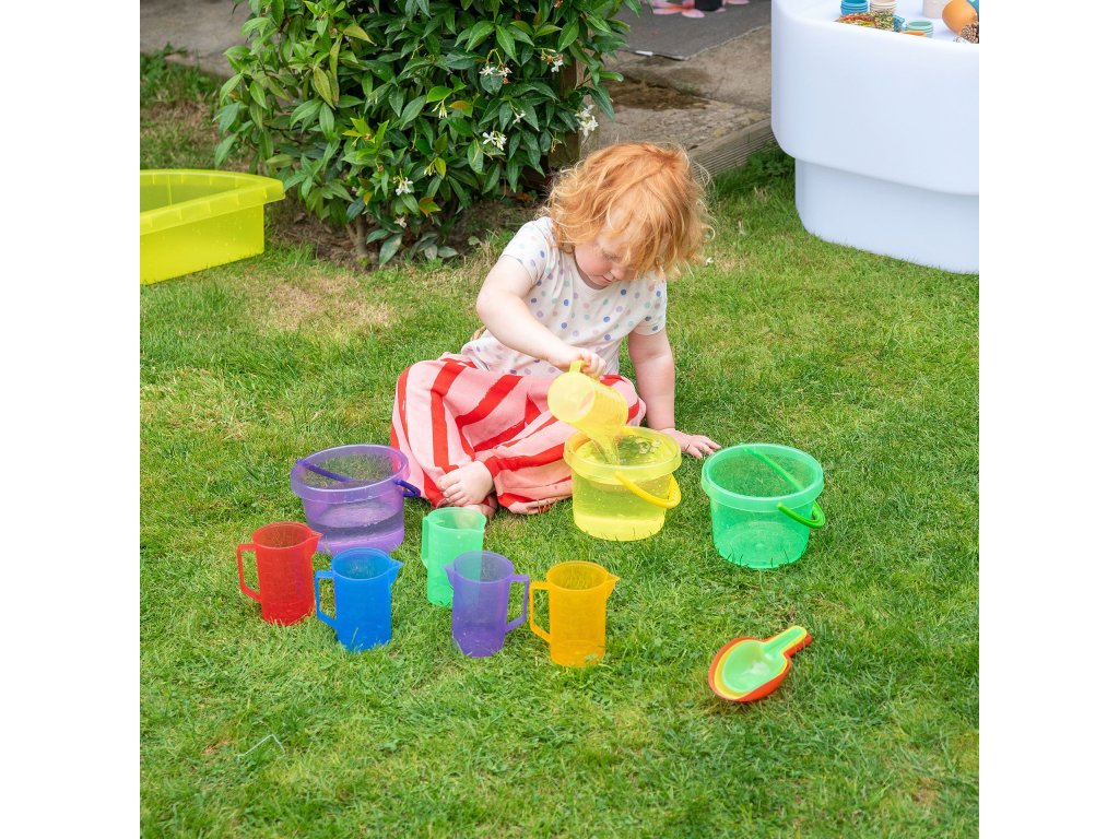 Farebné džbániky sú vyrobené z odolného priehľadného plastu, vďaka čomu sú ľahké, bezpečné a zároveň vhodné na každodenné používanie pri detskej hre. Tieto univerzálne pomôcky sú vhodné nielen pre domáce prostredie, ale aj pre materské školy či Montessori herne, kde deti môžu kreatívne skúmať vodu, piesok, zrná alebo iné materiály.