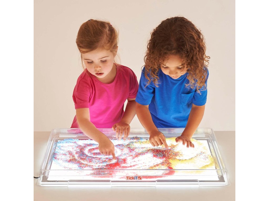Deti môžu skúmať rôzne umelecké, tvorivé a senzorické aktivity, pracovať s tekutinami, materiálmi rozličnej konzistencie a textúry či vytvárať scény z malého sveta. Vďaka svetelnému podsvieteniu sa všetky objekty a materiály krásne rozžiaria a poskytnú deťom úplne nový zmyslový zážitok.