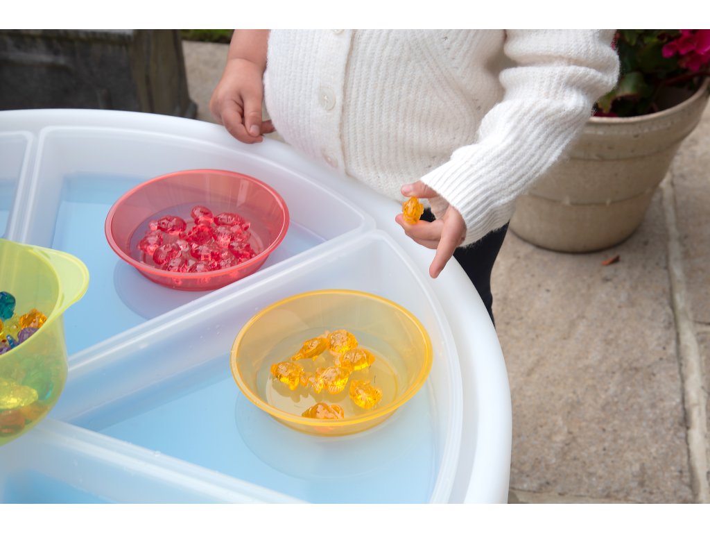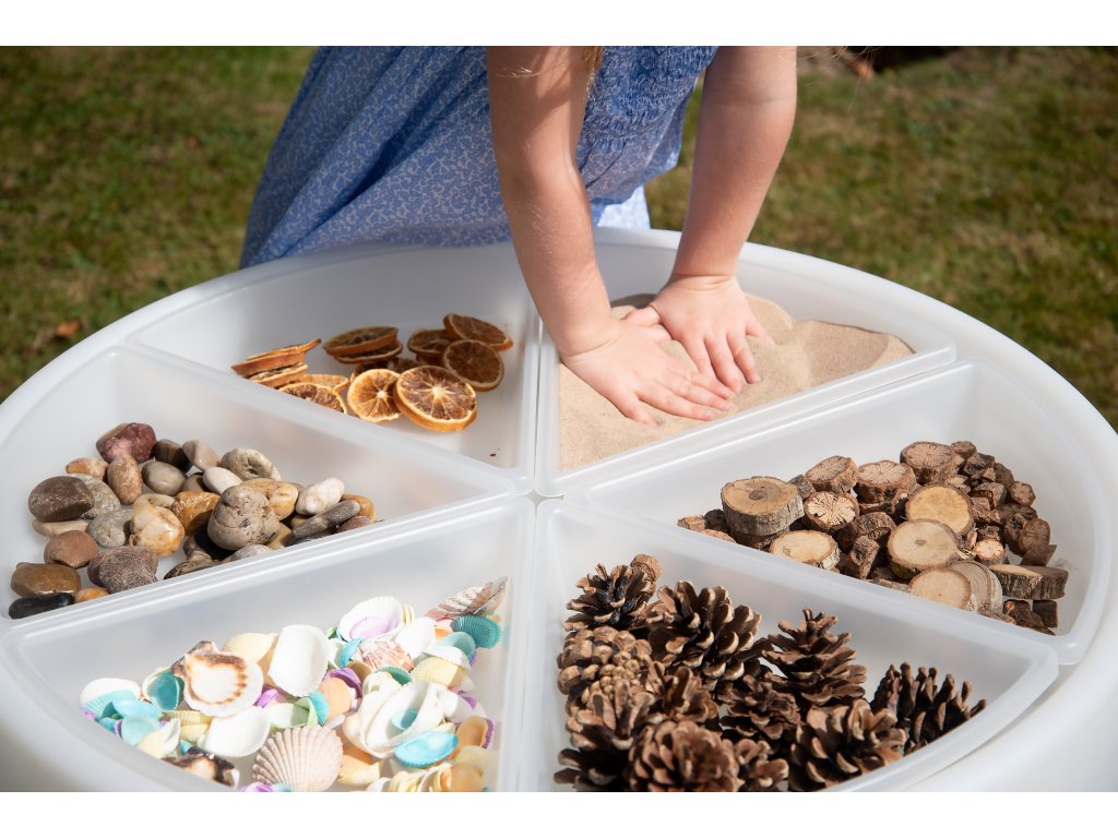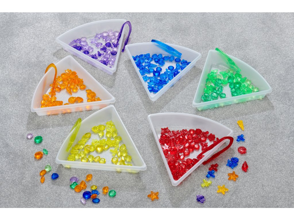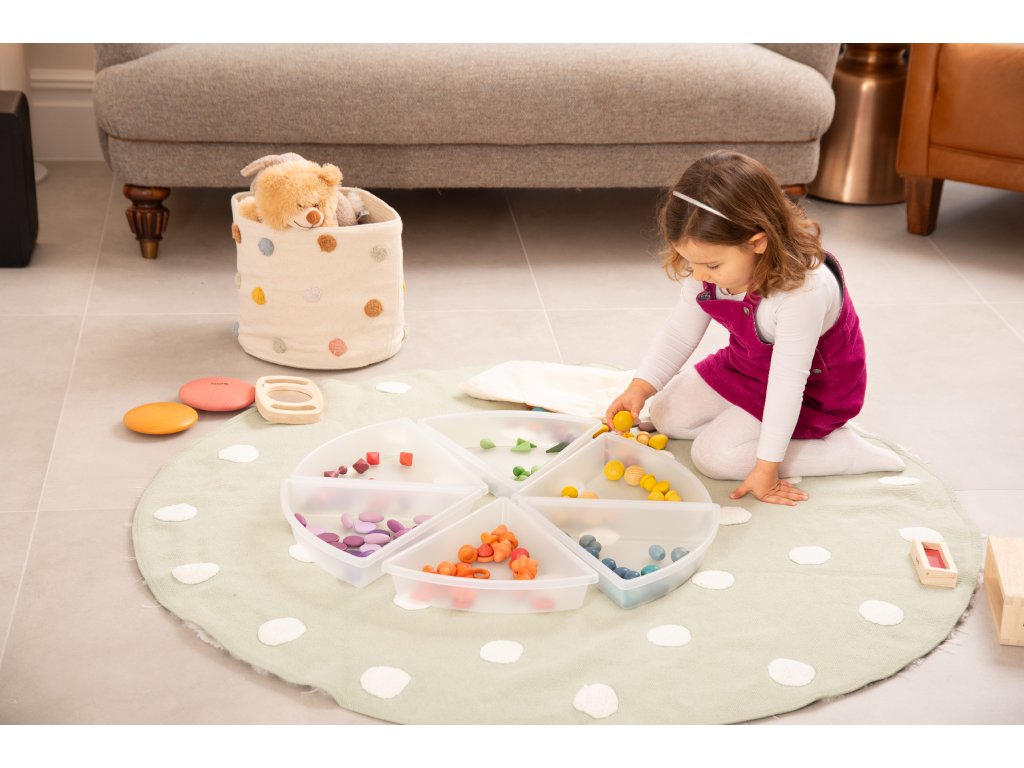 Všestranné využitie zahŕňa triedenie a usporiadanie, messy play (špinavú hru), prenášanie a vylievanie, vytváranie miniatúrnych scén malého sveta a skúmanie farieb alebo zmyslov. Zásobníky sa ľahko čistia a ľahko sa skladujú- úhľadne ukladajú na seba.