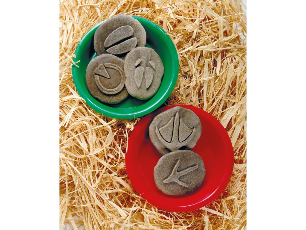 Zatlačte stopu do kinetického piesku, plastelíny, blata alebo pôdy a vytvorte chodník, ktorý môžu deti sledovať.Každý obojstranný kameň má na jednej strane vyvýšenú stopu zvieraťa a na druhej strane je vyobrazený obrázok zvieraťa.Aké zviera nájdu na konci: kravu, kone, ovcu, prasa, psa, mačku, kura alebo kačicu?